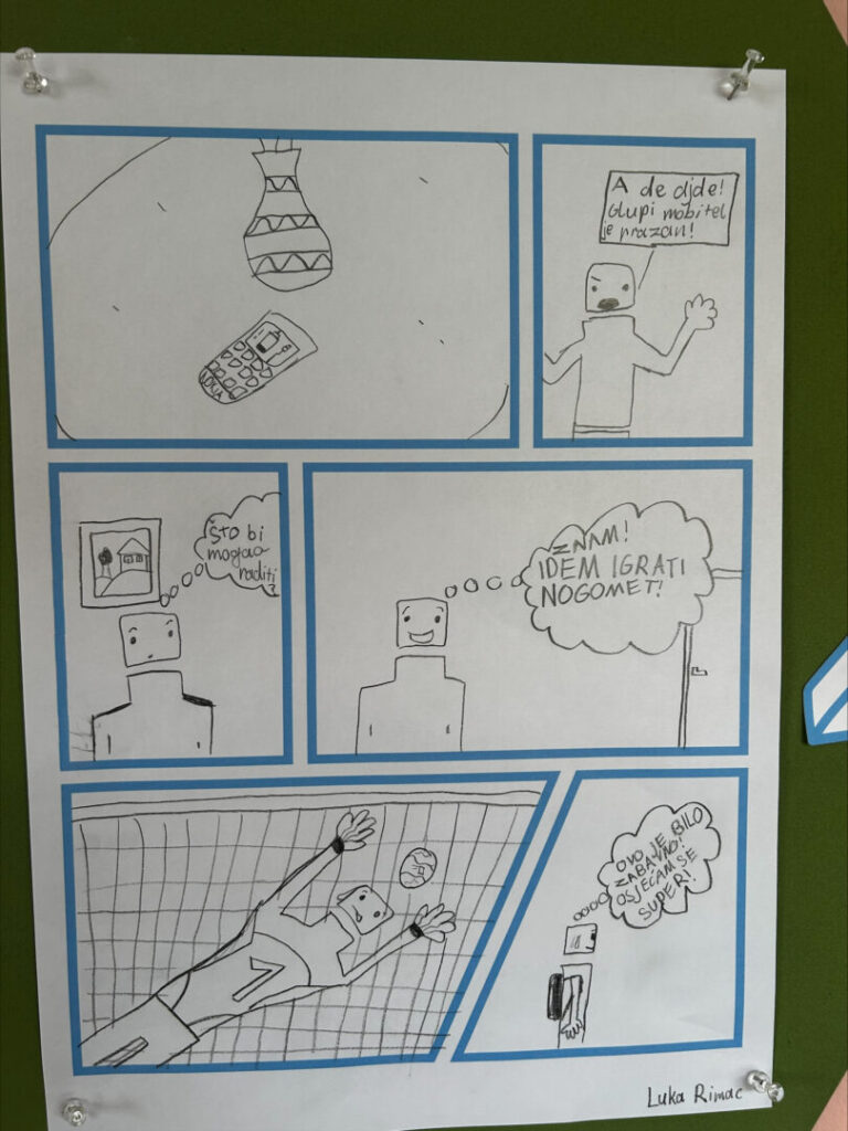 Učenici 5. i 8. razreda sudjelovali su u kreativnoj aktivnosti izrade mini stripova pod nazivom „Dan bez mobitela“. Kroz crtež i kratke priče učenici su promišljali kako izgleda jedan dan bez digitalnih uređaja, koje emocije pritom doživljavaju te koje aktivnosti, hobije i oblike druženja tada otkrivaju. Stripovi su pokazali da mašta, igra, razgovor i kreativnost ne ovise o ekranu.
