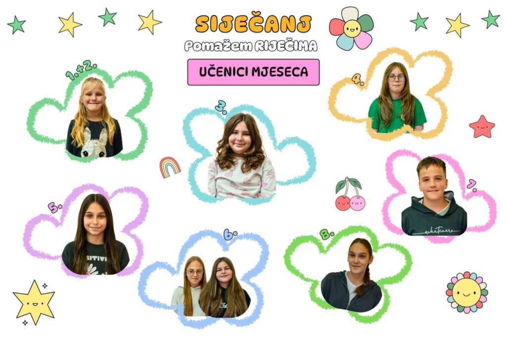 Na temelju svakodnevnog ponašanja, korištenja lijepih riječi, poticanja drugih i stvaranja pozitivne atmosfere u razredu, odabrani su učenici mjeseca siječnja. Čestitamo učenicima koji su se posebno istaknuli ljubaznošću, pažnjom prema drugima i primjerima kako se riječima može pomoći i graditi zajedništvo.