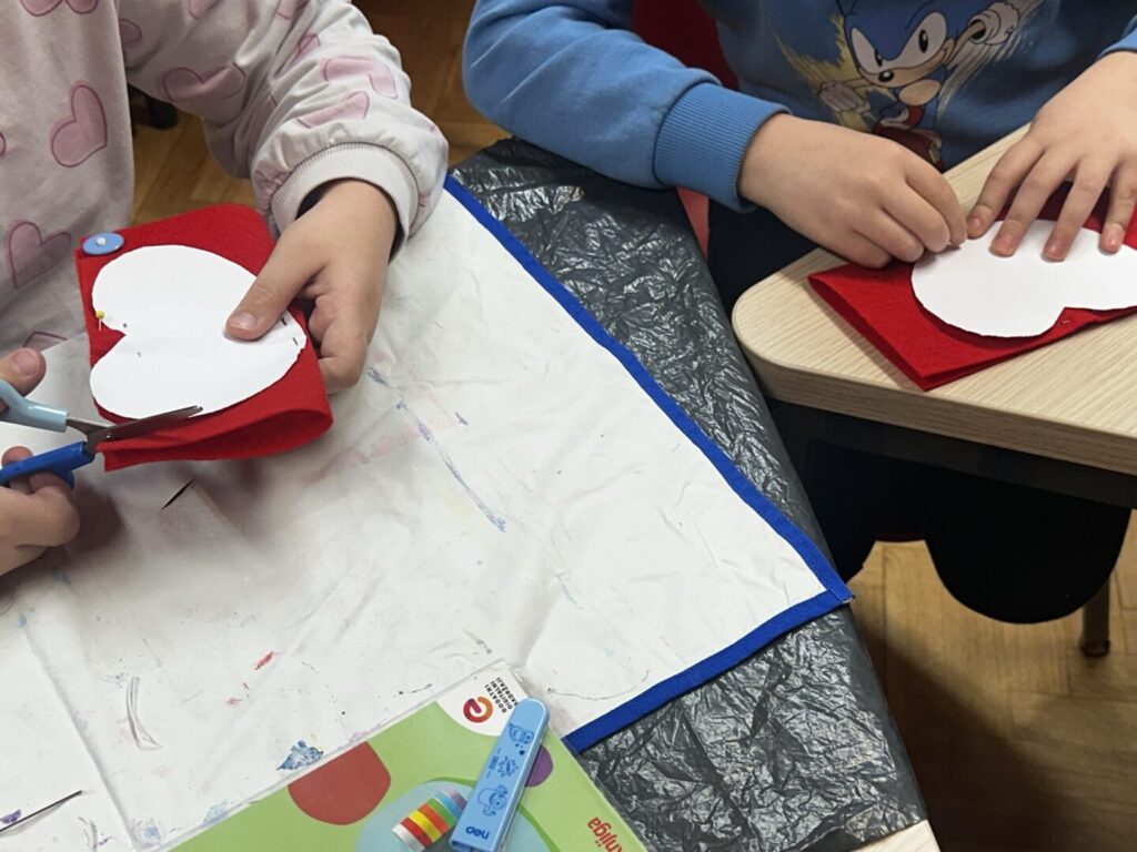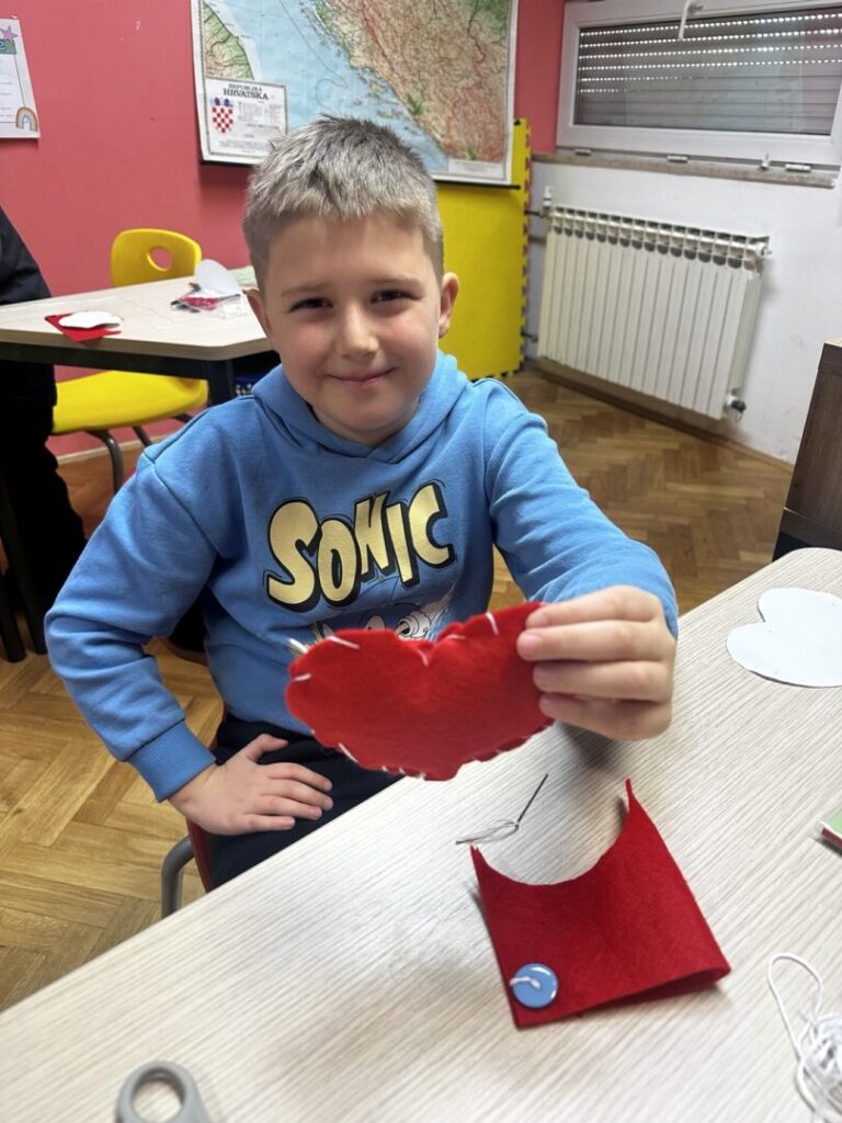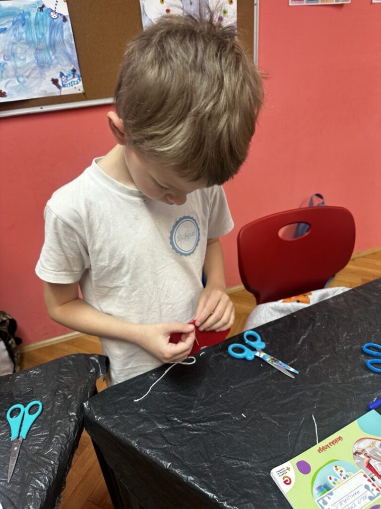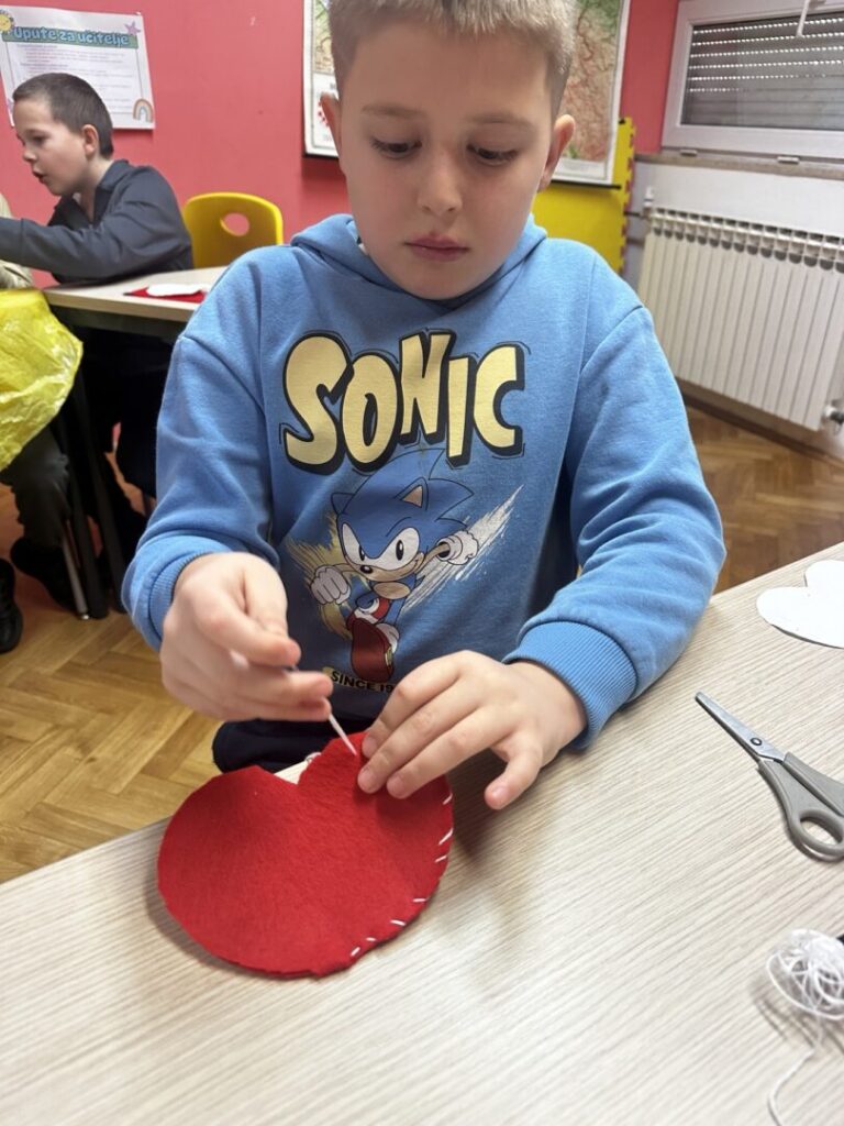 naučili pravilno i sigurno rukovati šivaćim priborom (igla, konac, škare), navoditi konac u iglu i prišivati gumb na tkaninu. Osmislili smo i izradili srce od tkanine.