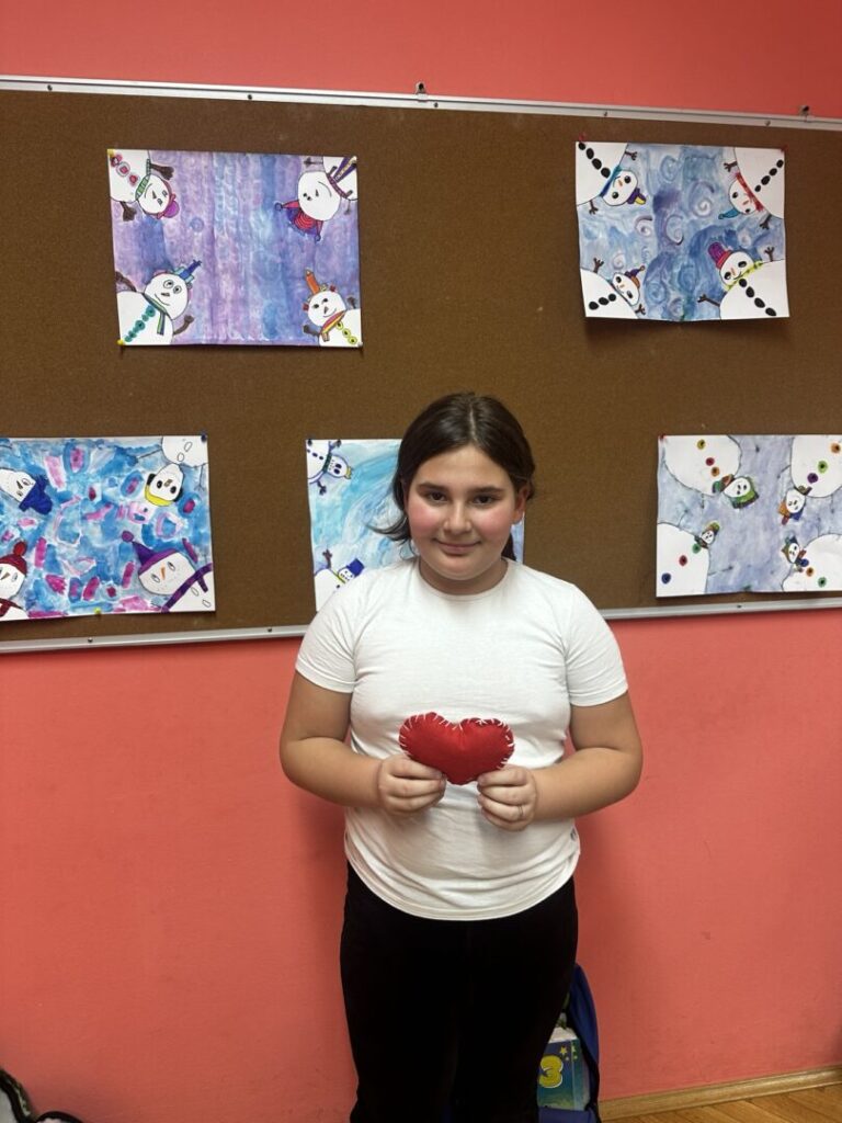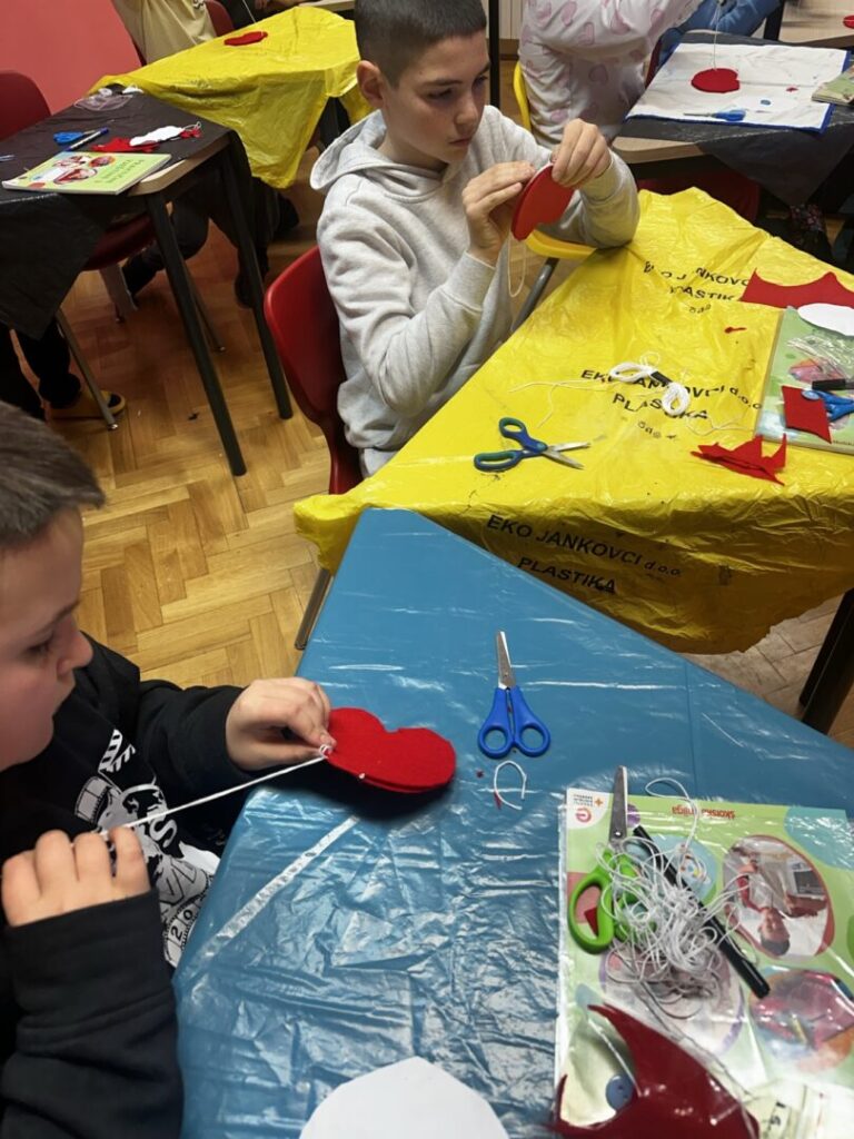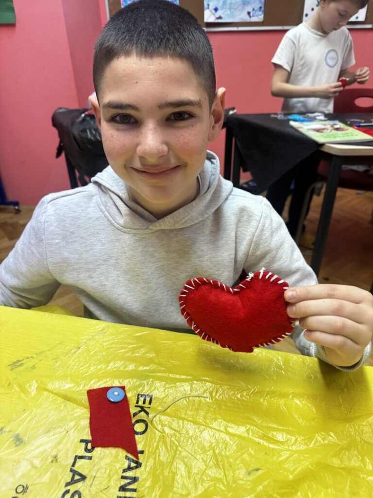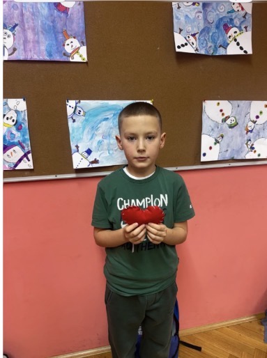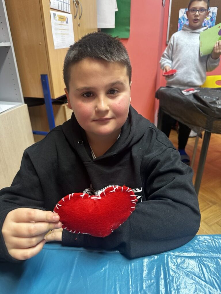 naučili pravilno i sigurno rukovati šivaćim priborom (igla, konac, škare), navoditi konac u iglu i prišivati gumb na tkaninu. Osmislili smo i izradili srce od tkanine.