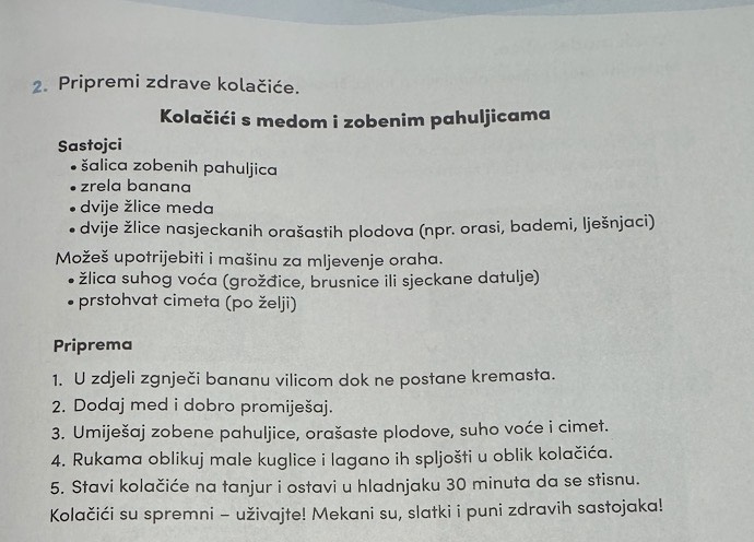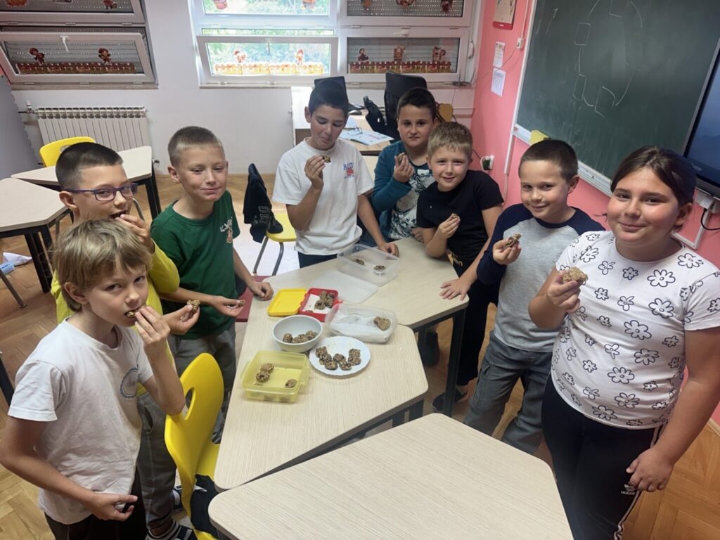 Učenici 3. razreda na satu Praktičnih vještina učili su da dan treba započeti zdravim obrokom. U udžbeniku se nalaze dva recepta – jedan za pripremu zdravih kolačića, a drugi za pripremu zdravog doručka. Učenici su se okušali u pripremi zdravih kolačića. Kušali su sve pripremljene zdrave kolačiće. Ponudili su zdravim kolačićima nastavnike i prijatelje. Kako su uživali u izradi i kušanju zdravih kolačića, možete pogledati u galeriji.